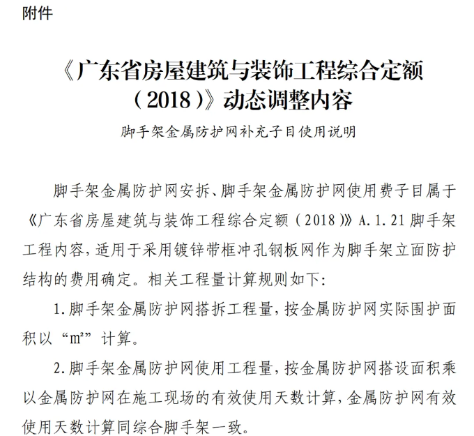 为进一步提升我省建设工程项目的安全绿色施工管理水平,经测算,补充《广东省房屋建筑与装饰工程综合定额(2018)》脚手架金属防护网相关定额子目,现印发你们,请遵照执行。