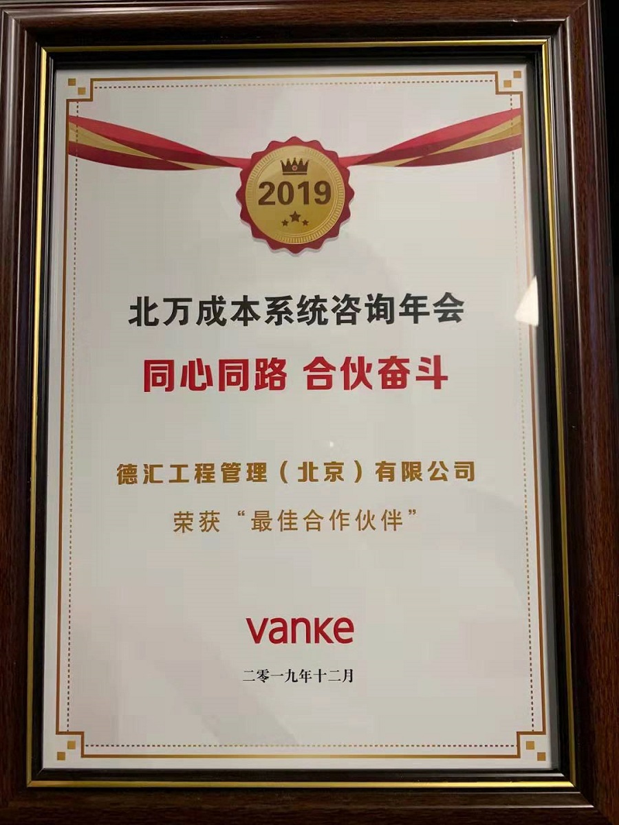 2019126日下午4点,德汇工程管理(北京)有限公司受邀参加由北京万科组织的2019年度成本管理研讨会及表彰大会,造价一部经理林晓东代表德汇造价部分享了诸多与北京万科合作心得及管理经验,受到一致好评。最后北京万科成本部对优秀合作单位及优秀个人进行表彰,德汇荣获“最佳合作伙伴”,5名员工荣获“优秀个人奖”。