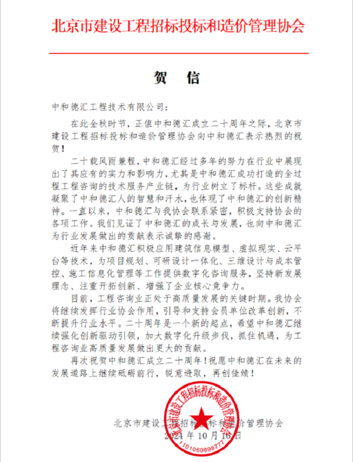 2024年10月16日,正值中和德汇成立20周年之际,公司又收到了北京市建设工程招标投标和造价管理协会的热烈祝贺。这封贺信不仅是对我们过去20年辛勤付出和卓越成就的肯定,更是对我们未来发展提出了更高的期望。我们将全力以赴在京标价协工作指导下,积极参与行业合作,提升技术创新能力,为业主提供更加优质的服务,共同为推动工程咨询行业的健康发展贡献力量。